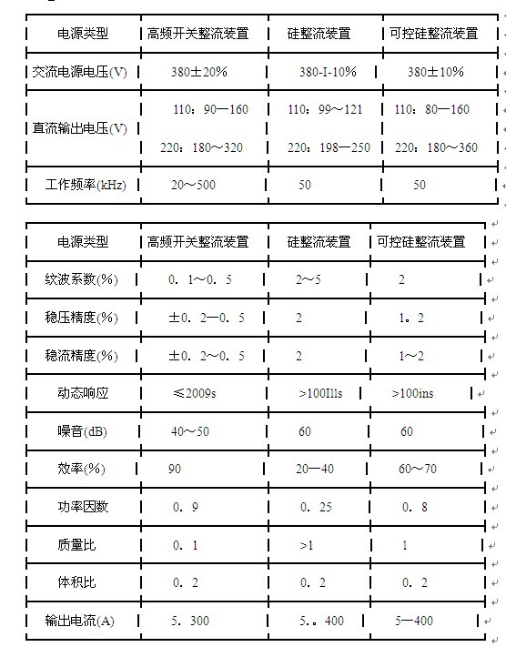 表6-4 高頻開關整流裝置和可控硅、硅整流器充電裝置技術指標比較